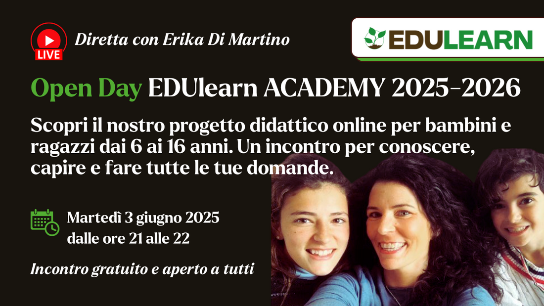 Ti invitiamo a iscriverti alla diretta di presentazione dell’EDUlearn ACADEMY, il percorso educativo online che unisce apprendimento, gioco, relazione e crescita personale, pensato per studenti dai 6 ai 16 anni.